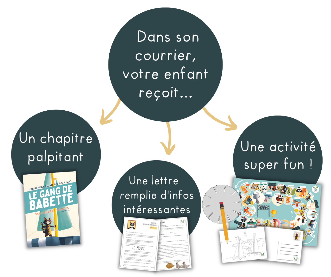 Toutes les deux semaines, votre petit reçoit une enveloppe dans votre boîte aux lettres. Celle-ci contient un chapitre sous forme de livret, une lettre d'introduction et explicative ainsi que le matériel d'une activité en rapport avec sa lecture.