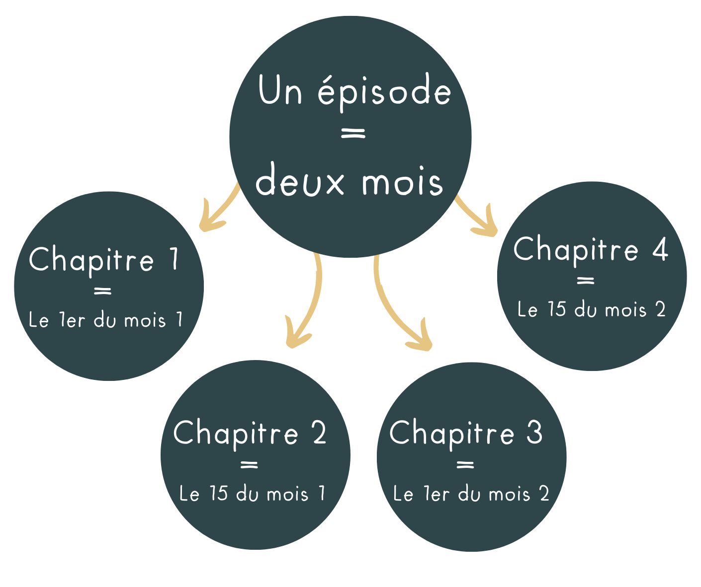 Les chapitres sont envoyés le 1er et le 15 de chaque mois.